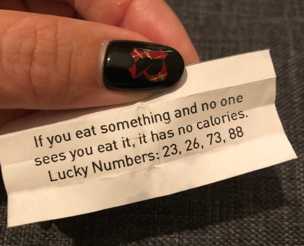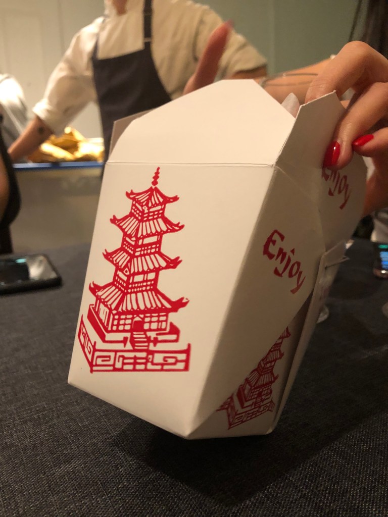 This one I did not expect. Handmade tuile fortune cookies that were a little fragile but oh so buttery were handed out in typical takeout boxes usually used by Chinese family restaurants in the States. “If you eat something and no one sees you eat it, it has no calories”, was what my slip read.