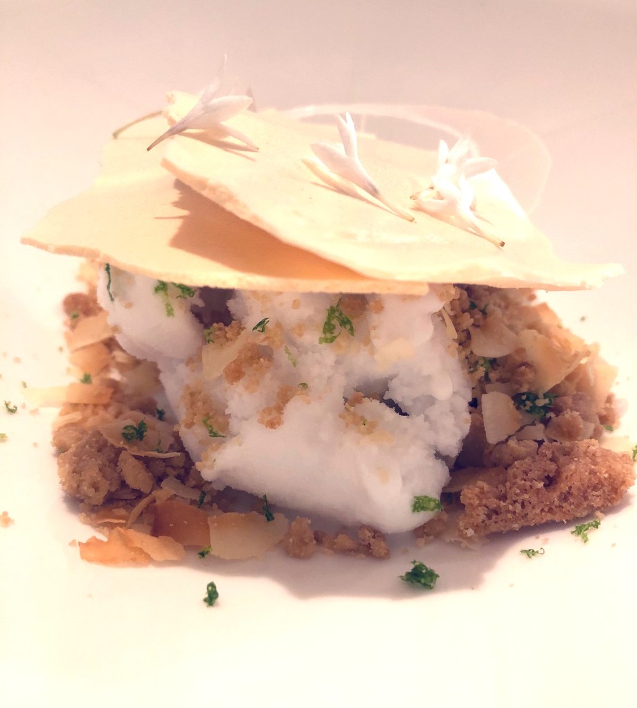 Textures of coconut – coconut sorbet, coconut crumble, coconut meringue
