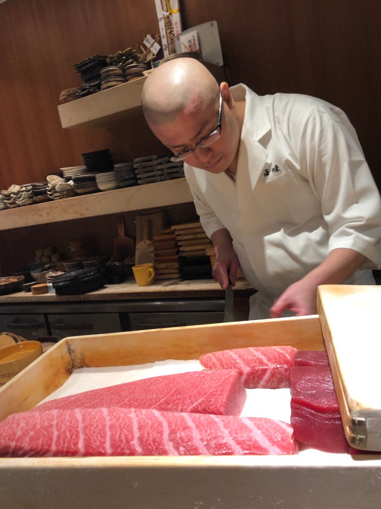 Coming from the same 216kg tuna, deep red akami and otoro (the one that looks like marbled steak),