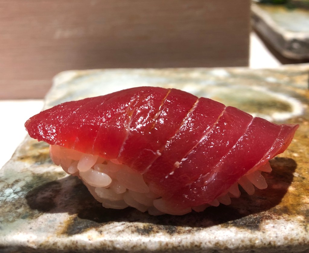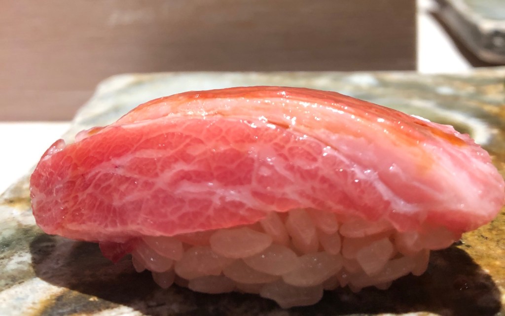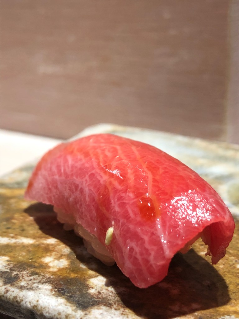 Also originating from Aomori, this tuna has been aged for nine days and was part of the 216kg fish. (I smudged the nigiri-zushi with wasabi, oops.) Just look at that gorgeous color.