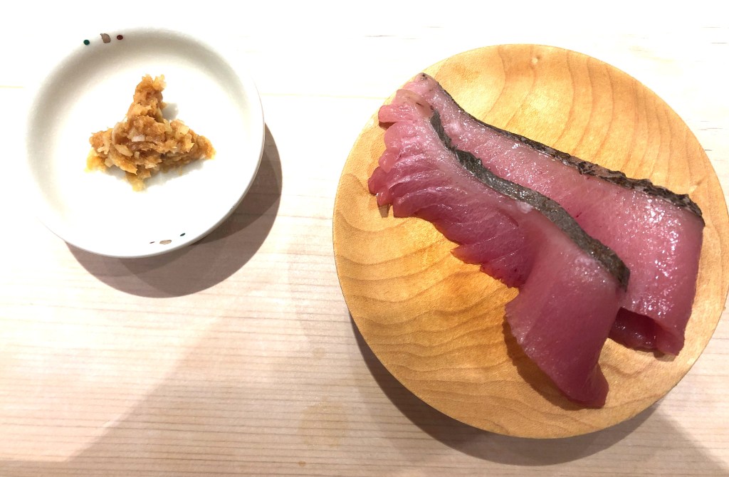 Have you have this before? Incredible. These are two extended slices of baby tuna with a side of chunky shrimp paste (if you know what it is, tell me!). The unctuous slices came with yama (mountain) wasabi, and how I ate them was to fold them into three with a generous swab of the paste. It’s not as fatty and rich as the belly but it’s meaty and oily enough to stand on its own au naturel. And I’ll say it again, this is one of the many firsts at this meal.