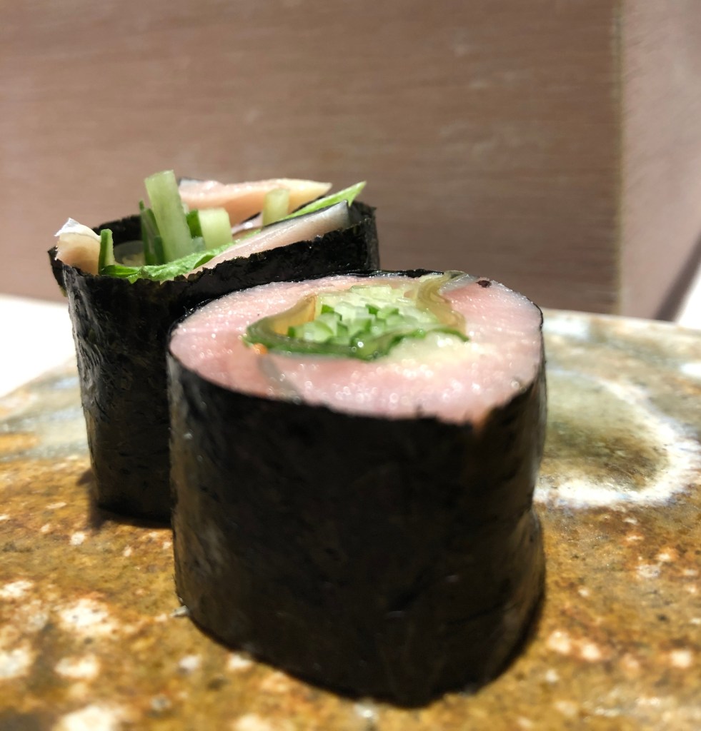 This is specifically kan-saba or cold mackerel from Chiba. The fatty fish is served raw and gutted with julienned cucumbers, sansho pepper and ginger. I’ve never had this as a roll before, as it looked like a maki without the rice. I remember biting into this and just feeling the crispness of the vegetables and the vinegared marination of the fish. Chef’s magic touch on this was undeniable