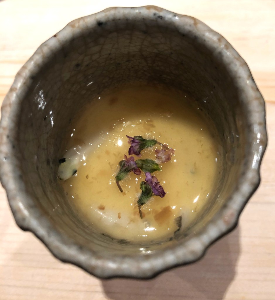 Whole white “Japanese anchovies” were cooked in eggs from Aomori. As you can tell, the egg “custard” was not the usual firmness but soft and a little runny. Keeping the seafood in its wholeness that’s quite unlike regular chawanmushi where small precious pieces of a few types of seafood are mixed together and sometimes even one or two gingko nuts. This was my first time ever having such a decadent combination.