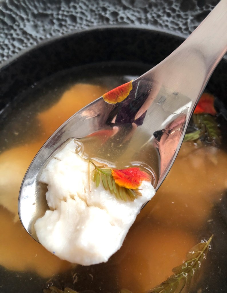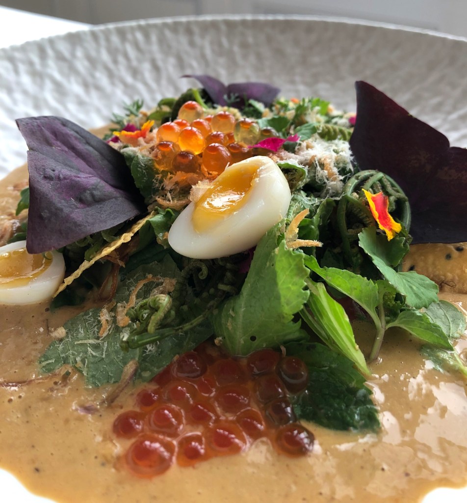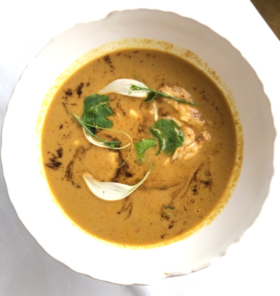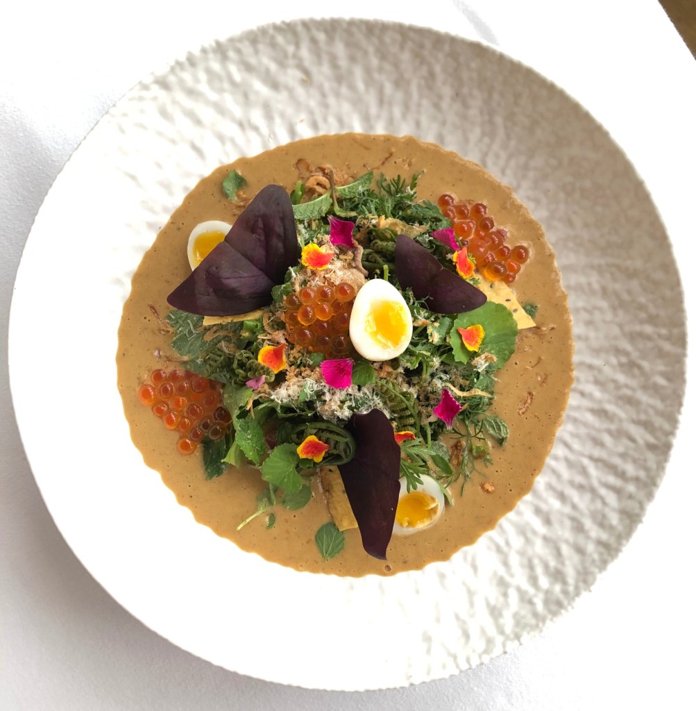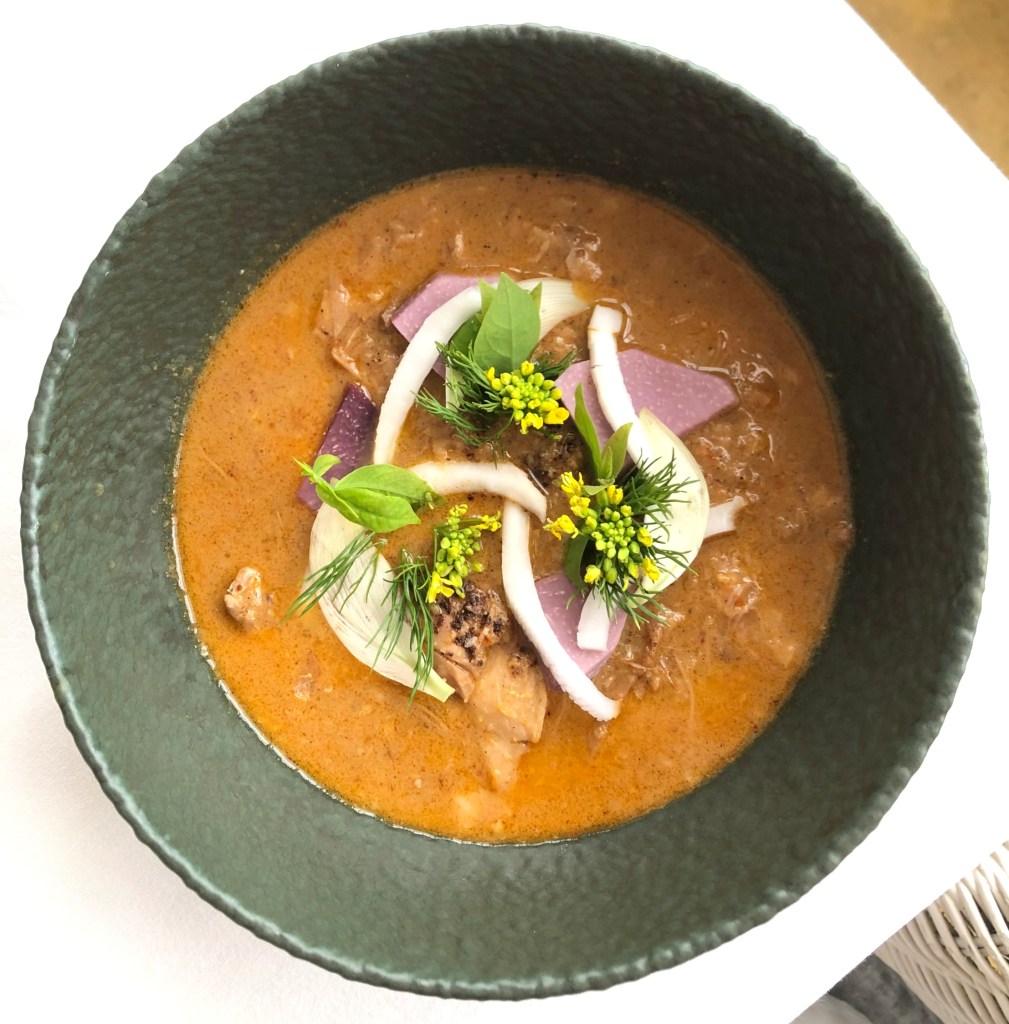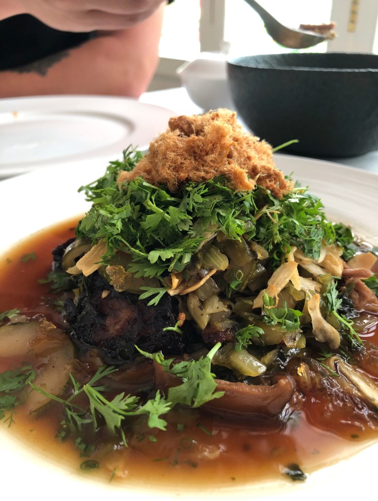 Sometimes referred to as Yum Salat or “Salad of Salad”, this dish gets its inspiration from the original all-vegetarian royal recipe that was a Laotian-French fusion it seems. The one we had was all-together umami (not vegetarian) with additions of salted quail’s egg, generous sprinkling of cured salmon roe, crispy sea kelp and Asian watercress. Jicama crackers and fried shallots for some crunch, and butterfly woodsorrel leaves lent a touch of acidity to the creamy dressing that’s traditionally composed of lime juice, shallot oil and fish sauce. This one used some kaffir lime leaves and perhaps rinds for more intense fragrance.