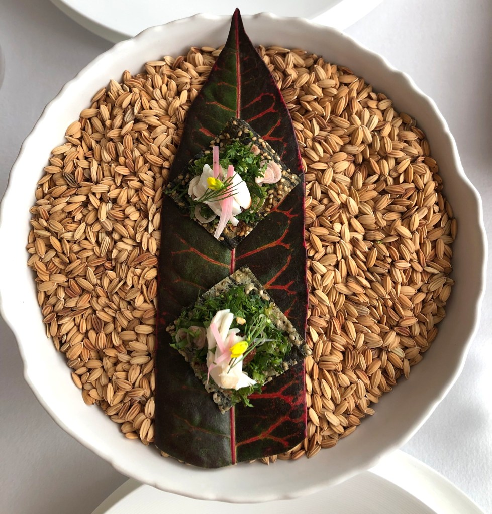 To be eaten in one bite, our first snack was this meaty chunk of sweet spanner crab on sticky chili jam or jaew bong that’s sweet and spicy at the same time, and usually engages chili, galangal, water buffalo skin and other local ingredients. Find also sliced shallots, lemongrass, fried garlic chips, ginger torch flower and river weeds that completed the aesthetic. All these fresh herbs on fried betel leaf dotted with puffed rice.