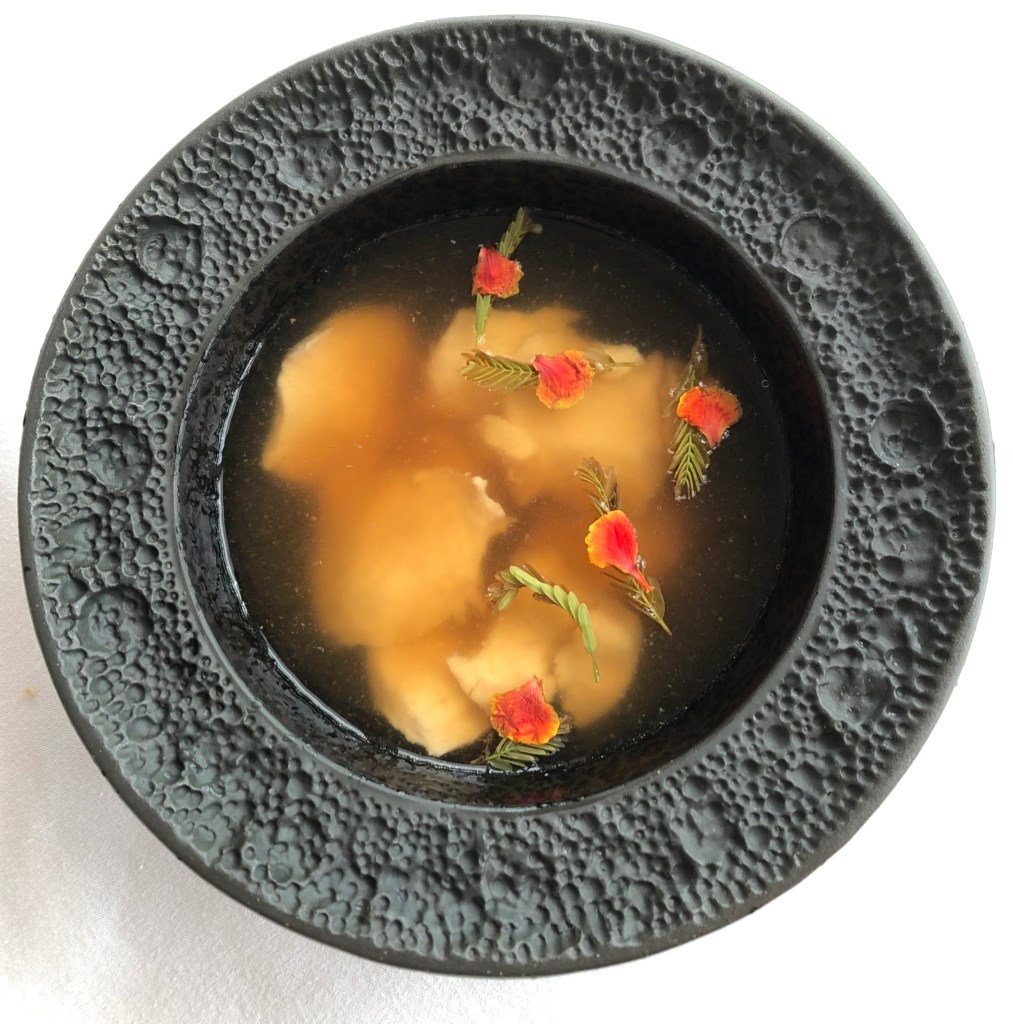 Fresh, fresh, fresh! Opening this degustation was this salad that’s one of Paste Bangkok’s signature dishes using grounded salmon. However, the fish used here was caught directly from the Mekong River – the giant catfish. The flesh was dried and made into fish floss before being fried with sugar, and combined with crispy shallots and roasted galangal powder. Coriander and sweet basil make up the greens with some fish roe and pink Chain of Love flowers. We were advised to have every spoonful of the appetizer with fresh watermelon balls.