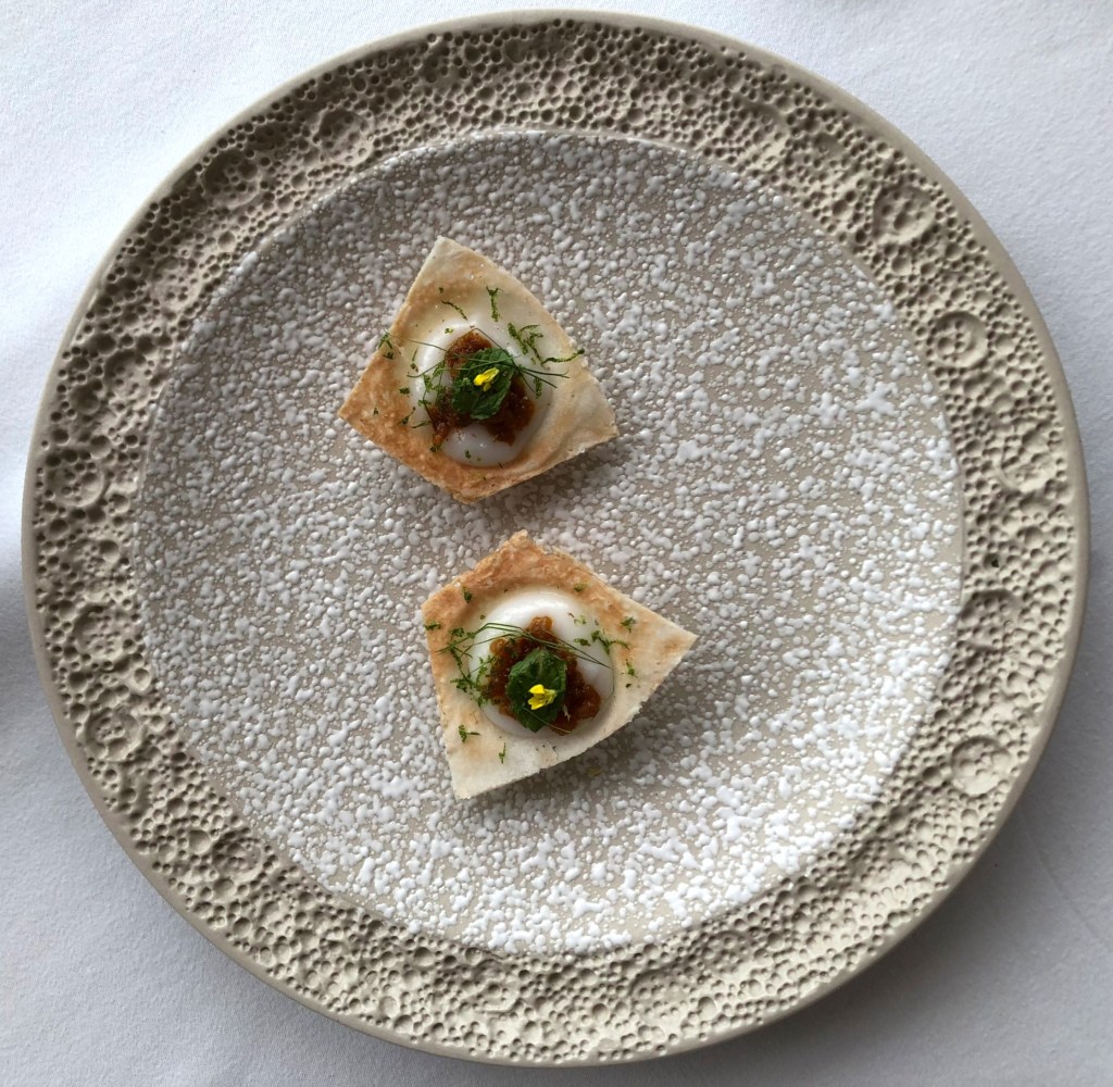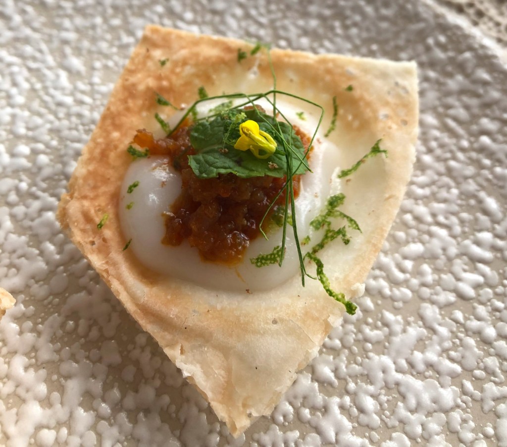 A little crucible made of coconut cream wafer was filled to the brim with the cream, and then topped with traditional spicy dried king prawn relish, a mint leaf and dill, both herbs used frequently in this country of seven million people. I stuffed this whole thing in my mouth and allowed the creaminess to take over, then waited for the spiciness to kick in shortly after but the latter didn’t really happen. So it was just sweet with a little crunch.