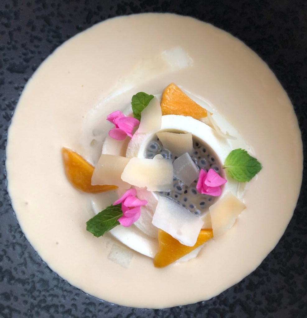 At first look, this looked and smelt like bubur chacha because of the pop of lively colors, and what I thought was coconut and condensed milk “soup”. However the melange of fruits and textures made it so delightful to chew on the chilled dessert of smoked coconut strips with palm sugar sabayon, lemon basil seeds and dried mango shards