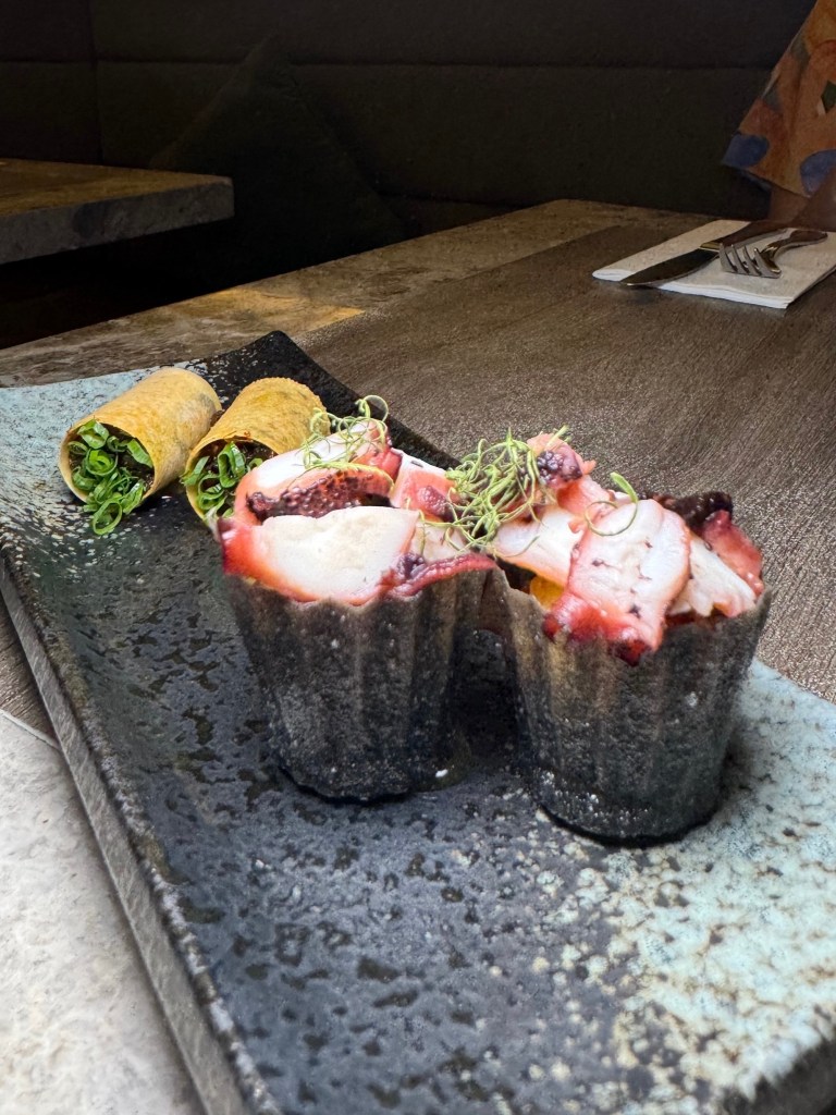 Chargrilled octopus pie tee – pineapple kerabu (salad) tossed with lemongrass & chilies, topped with chargrilled octopus in black kueh pie tee shell