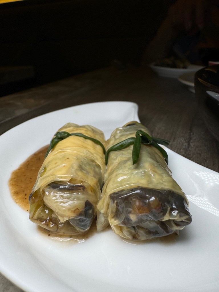 A champion’s dish followed. Chef Ian cooked nonya chap chye* with woodear mushrooms, cabbage, fatt choy (black moss) & tang hoon, to name a bunch. All the goodness was wrapped in beancurd skin, and steamed. Each meatless parcel was so juicy. This was such a treat because it was this very dish that the 27-year-old chef created and served at the international competition in Monaco – the same recipe and presentation.
