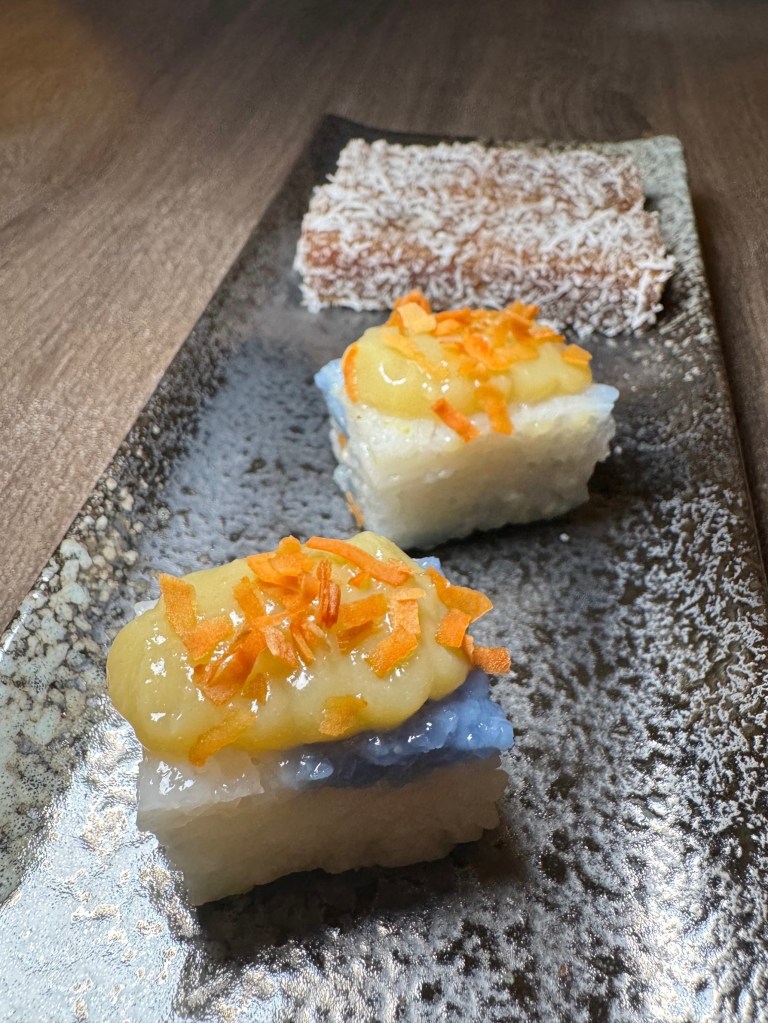 It didn’t end there. There was petit four – well, two really. Pulot tai tai which is sweet glutinous rice topped with kaya (coconut-egg jam) and toasted coconut flakes, and steamed kueh kosui made with gula melaka, and coated with fresh shredded coconut. Both kueh were so soft and tasted as they should. I could dig into a big tub of them on any given lazy weekend on the couch.