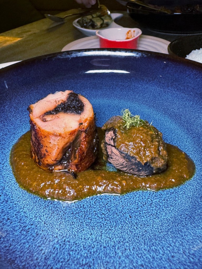 Ayam buah keluak* came next. Chef Mag was inspired by her grandmother’s recipe, but plated it in a modern way – gently poached chicken roulade caramelized on the outside with rempah (spice mix), paired with what some Peranakan’s dub as “black gold” aka buah keluak. It’s a very tedious process of cleaning and extracting the paste, cooking it then stuffing it back in the kepayang seed. In this case, there was no seed so no need to dig for “gold” 🤣 I was really shocked that I really enjoyed the almost chocolate-y flavor of buah keluak, something I have not touched in many years because l don’t like the overpowering “woody” / “musky”-ness. Safe to say, buah keluak is most definitely an acquired taste, like uni and moutai!