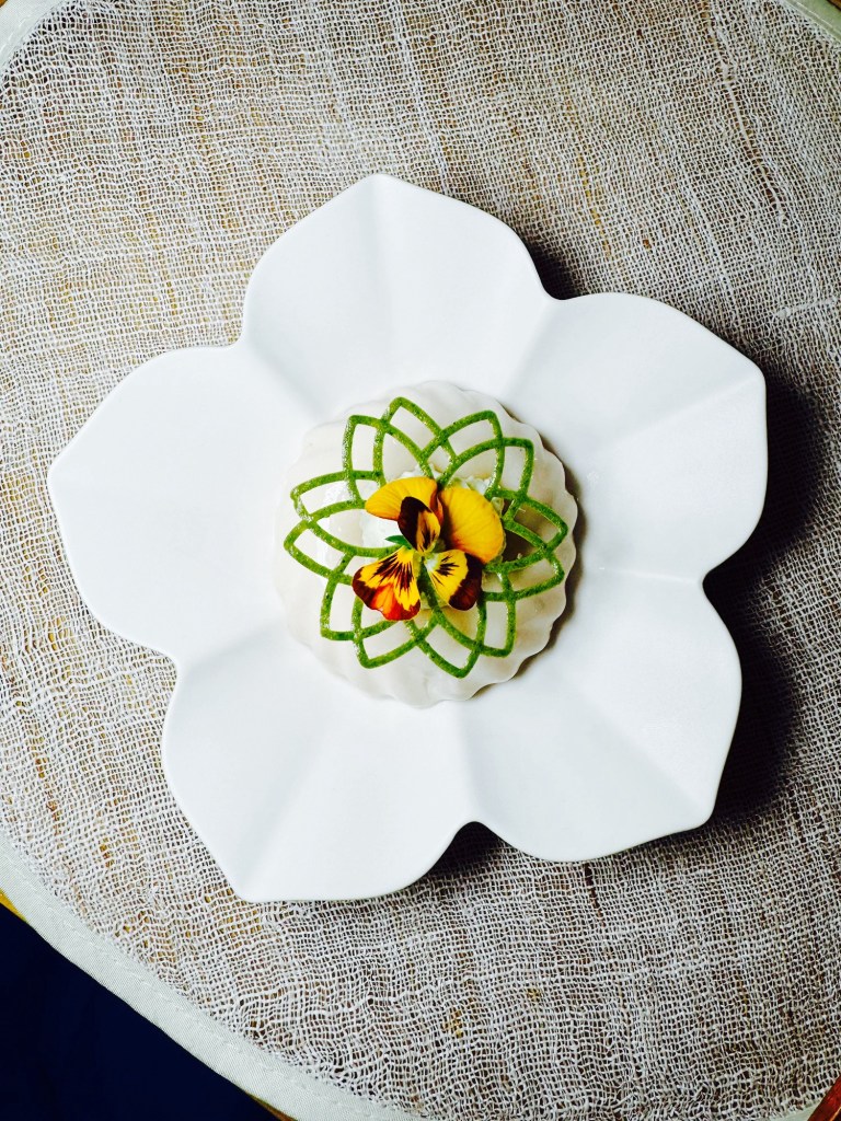 Omija means five flavors – sweet, sour, salty, bitter and pungent. Break into the pudding with a spoon and discover peach compote & gwahaju, with basil cream and tuile on top with a flower. Basil and peach is one of Chef’s favorite pairings. I do like sweet endings with some tangy-ness to it instead of just sweet, sweet, sweet.