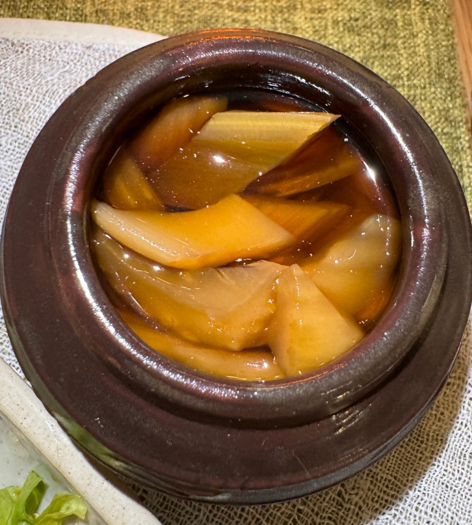 This won everyone’s hearts around the table – flower-shaped makgeolli (or makkoli) bread. Makgeolli is a low abv rice wine that’s cloudy and is a common drink in Korea. Chef Aesil repurposed the yeast in unpasteurised makgeolli for the dough. The menu refers to this as “bread” but the texture is soft and bouncy, and the consistency is more like kueh or taiyaki batter. Burnt corn butter accompanied the tiny morsels but I didn’t need the butter at all. Having the “bread” on its own allowed me to taste a little sweet and fermented flavors.