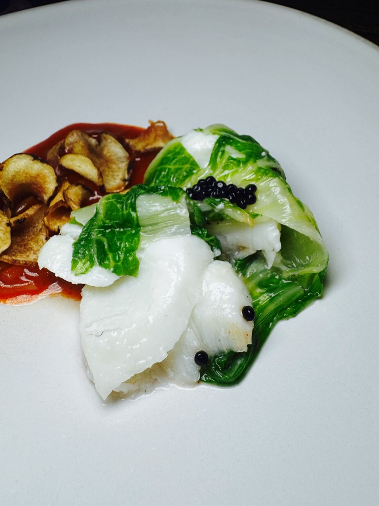 Sunchoke chips, Chef’s homemade jjim (“steam” in Hangeul) sauce, korean beansprouts and truffle caviar complete the dish. I’ve always liked cod over silver-skinned fish for its oiliness and flaky flesh.